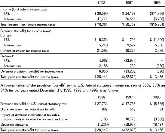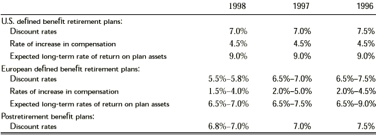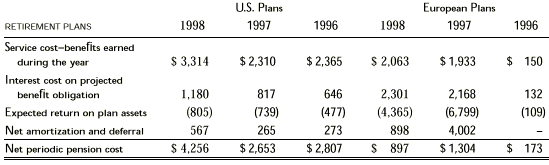 The projected benefit obligation, accumulated benefit obligation, and fair value of plan assets for pension plans with accumulated benefit obligations in excess of plan assets were $21,545, $18,858 and $11,545, respectively, as of December 31, 1998 and $14,910, $13,037 and $8,343, respectively, as of December 31, 1997. In 1998, the company updated certain assumptions with respect to its European plans, resulting in an actuarial loss. Amortization of this loss and other prior service costs, is calculated on a straight-line basis over the expected future years of service of the plans’ active participants. Assets for the defined benefit pension plans generally consist of publicly traded securities, bonds and cash investments. As of December 31, 1998 and 1997, the prepaid benefit cost was included in “investment in affiliated companies and other assets” in the accompanying consolidated balance sheets. For the same periods, the accrued benefit cost was included in “accrued compensation and benefits” and “other non-current liabilities” in the accompanying consolidated balance sheets. Assumptions used to estimate the actuarial present value of benefit obligations as of December 31, 1998, 1997 and 1996, were: