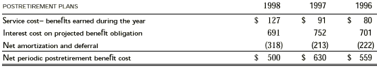Benefit Plans Benefits are available to eligible employees who retire on or after age 58 after rendering at least 15 years of service to Hexcel, including years of service rendered to the Acquired Ciba Business or the Acquired Hercules Business prior to the dates of acquisition. Benefits consist of coverage of up to 50% of the annual cost of certain health insurance plans, as well as annual life insurance coverage equal to 65% of the final base pay of the retiree until the age of 70. Upon reaching 70 years of age, life insurance coverage is reduced. As part of the Acquired Clark-Schwebel Business, the company assumed a defined benefit postretirement medical plan, which covers substantially all salaried and nonsalaried employees. The plan provides medical coverage to age 65 for employees who retire at age 62 or later, have at least 25 years of service and participated in the plan prior to retirement. The net periodic cost of Hexcel’s defined benefit retirement and US postretirement plans for the years ended December 31, 1998, 1997 and 1996, were: