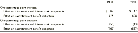 For measurement purposes, the annual rate of increase in the per capita cost of covered health care benefits were assumed at 7.5% to 10.2% for medical, and 5.0% for dental and vision for 1999. These rates were assumed to decrease gradually to 5.5% to 8.4%, and remain at 5.0%, respectively, by the year 2002. The table below presents the impact of a one-percentage point increase and a one-percentage point decrease in the assumed health care cost trend on the total of service and interest cost components and on the postre-tirement benefit obligation.