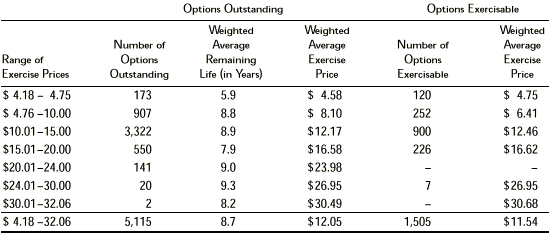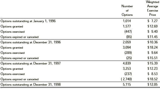 The number of options exercisable as of December 31, 1998, 1997 and 1996 were 1,505, 1,193 and 841, respectively, at a weighted average exercise price of $11.54, $9.80 and $8.64, respectively. The following table summarizes information about stock options outstanding at December 31, 1998: