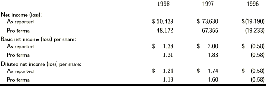 The weighted average fair value of options granted during 1998, 1997 and 1996 was $12.23, $18.24 and $12.75, respectively. The following ranges of assumptions were used in the Black-Scholes pricing models for options granted in 1998, 1997 and 1996: risk-free interest of 4.6% to 6.3%, estimated volatility of 40% to 51%, dividend yield of 0.0%, and an expected life of 1 to 10 years.