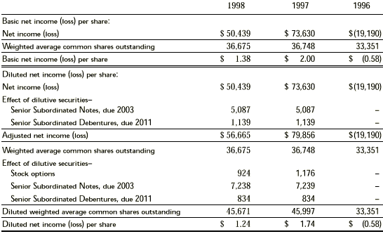 The Convertible Subordinated Notes, due 2003, which were issued in 1996, and the Convertible Subordinated Debentures, due 2011, were excluded from the 1996 computation of diluted net loss per share as they were antidilutive. Substantially all of the company’s stock options were included in the calculation of the diluted earnings per share for the years ended December 31, 1998 and 1997.