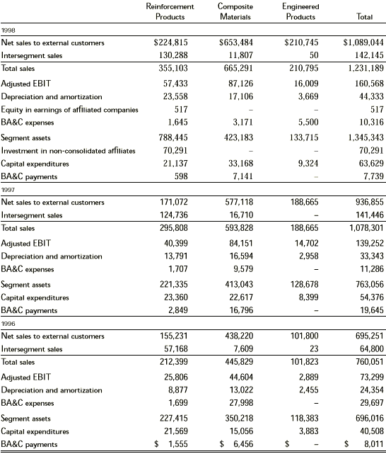 N o t e 1 6 - S e g m e n t I n f o r m a t i o n The financial results for Hexcel’s operating segments have been prepared using a management approach, which is consistent with the basis and manner in which Hexcel management internally segregates financial information for the purposes of assisting in making internal operating decisions. Hexcel’s operating segments and related products, are as follows: REINFORCEMENT PRODUCTS: This segment manufactures and sells carbon fibers and carbon, glass and aramid fiber fabrics. These reinforcement products comprise the foundation of most composite materials, parts and structures. The segment weaves electronic fiberglass fabrics that are a substrate for PCBs. All of the company’s electronic sales come from reinforcement fabric sales. This segment also sells products for general industrial and recreation applications such as decorative blinds and soft body armor. In addition, this segment sells to the company’s Composite Materials segment and other third party customers in the commercial aerospace and space and defense markets. Sales from the Acquired Clark-Schwebel Business are included in this segment. COMPOSITE MATERIALS: This segment manufactures and sells composite materials, including prepregs, honeycomb, structural adhesives, sandwich panels and specially machined honeycomb parts, primarily to the commercial aerospace and space and defense markets, as well as to the general industrial and recreational markets. This segment also sells to the company’s Engineered Products segment. ENGINEERED PRODUCTS: This segment manufactures and sells a range of lightweight, high strength composite structures and interiors, primarily to the commercial aerospace and space and defense markets. Hexcel evaluates performance based on adjusted income before business acquisition and consolidation (“BA&C”) expenses, interest and taxes (“Adjusted EBIT”), and generally accounts for intersegment sales based on arm’s length prices. Corporate and other expenses are not allocated to the operating segments. The following table presents financial information on the company’s operating segments as of December 31, 1998, 1997 and 1996, and for the years then ended: