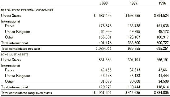 Net sales are attributed to geographic areas based on the location in which the sale originated. U.S. net sales include US exports to non-affiliates of $99,976, $70,875 and $53,333, for the years ended December 31, 1998, 1997 and 1996, respectively. Long-lived assets primarily consist of property, plant and equipment, intangibles, investments in affiliated companies and other assets, less long-term deferred tax assets. Significant Customers