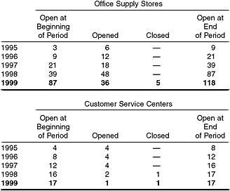 The decline in the number of stores opened in 1996 and 1997 was the result of our proposed merger with Staples, Inc. (Staples), which was terminated in July 1997. During this period of uncertainty, several of our key employees in the real estate area left the Company. See Merger and Restructuring Costs for more information on the proposed Staples merger. After the merger discussions with Staples were terminated, we re-staffed our real estate department and re-launched our store expansion program. We currently plan to open approximately 100 new retail stores in the United States and Canada during 2000. Our real estate strategy will stress a more analytical approach in the future, rather than focusing on a specific number of new stores. Over the past year, we have conducted extensive customer and market research that will provide us with a more precise evaluation of the profit potential and return on investment of each new store opening. Business Services Group (BSG) In 1993 and 1994, we expanded into the contract business by acquiring eight contract stationers with 18 domestic customer service centers and an established contract sales force. These acquisitions allowed us to enter the contract business and broaden our commercial (primarily catalog) and retail delivery businesses. Today, BSG sells office products and services to contract and commercial customers through our Office Depot® and Viking Office Products® direct mail catalogs and Internet sites, and by means of our dedicated sales force. Customer service centers (CSCs) are warehouse and delivery facilities, many of which also house sales offices, call centers and administrative offices. Our CSCs perform warehousing and delivery services on behalf of all our domestic segments of our business. Prior to our merger with Viking Office Products, Inc. (Viking) in August 1998, we replaced several outdated, inefficient facilities with new CSCs and converted all of our warehouse and order entry systems to one common technology platform. At the end of 1999, we operated 30 CSCs in the United States, 10 of which we added as a result of the Viking merger. We have initiated plans to integrate our Viking and Office Depot warehouses. We expect to accomplish this integration by either absorbing the Viking operations into existing Office Depot warehouses or by opening new combined warehouses, depending on the particular market circumstances. Once our integration is complete, we will operate 21 combined CSCs after closing nine Viking and two Office Depot CSCs and opening two new combined facilities. We have included the estimated costs of this integration in merger and restructuring costs. See Merger and Restructuring Costs for further information. Although we are integrating our warehouse and delivery network, we will continue to operate under both the Office Depot and Viking brands. In January 1998, we introduced our Office Depot public Web site (www.officedepot.com), offering our customers the convenience of shopping on-line. The addition of this site expanded our domestic electronic commerce capabilities beyond the Viking public Web site (www.vikingop.com) and the Office Depot business-to-business (B2B) contract Web sites. In 1999, our domestic Internet sales were $349.7 million, compared to approximately $66.5 million in 1998, an increase of 426%. Although this business channel is still in its infancy, we believe our Internet business will provide significant future growth opportunities for our BSG segment and our business as a whole based on the growth rates we have experienced over the last two years. International Division Our International Division sells office products and services to retail and commercial customers in 17 countries outside the United States and Canada. We launched our international direct marketing business in 1990 under the Viking brand with the establishment of our United Kingdom operations. In December 1993, we initiated our international retail operations by opening our first store in Colombia through a licensing agreement. We have expanded internationally through licensing and joint venture agreements, acquisitions and the merger with Viking. Prior to 1998, our international business was operated entirely through licensing and joint venture agreements. In 1998, we merged with Viking, whose international operations were wholly-owned, and we increased our ownership in our retail operations in France to 100%. In 1999, we increased our ownership in our retail operations in Japan to 100%. In March 1999, we introduced our first international public Web site (www.viking-direct.co.uk) for individuals and businesses in the United Kingdom; and in the first quarter of 2000, we introduced our public Web site in Germany (www.viking.de). We expect to introduce several new international Web sites in 2000 under both the Office Depot and Viking brand names, and we believe that the Internet provides a significant opportunity for international growth. At the end of 1999, there were 118 office supply stores in eight countries outside the United States and Canada operating under the Office Depot name, 32 of which were wholly-owned. This compares to 87 stores in eight countries, 15 of which were wholly-owned, at the end of 1998. In addition to these retail stores, our International Division has catalog and delivery operations in 13 countries. We operate our catalog business under the Viking brand in 11 of these countries and under the Office Depot brand in four of these countries. At the end of 1999, our International Division operated in Australia, Austria, Belgium, Colombia, France, Germany, Hungary, Ireland, Israel, Italy, Japan, Luxembourg, Mexico, the Netherlands, Poland, Thailand and the United Kingdom. International store and CSC operations, including facilities operated through licensing and joint venture agreements, for the last five years are detailed below. All years prior to 1998 have been restated to include facilities operat