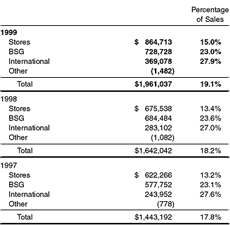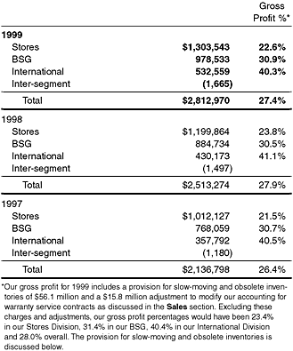 While we believe that this charge is non-recurring, we cannot assure you that we will not incur charges like this in the future. Excluding the charges and adjustments discussed earlier, decreased net product costs derived from merger-related synergies during 1999 drove our slight improvement in margins compared to 1998. However, offsetting these savings were increased occupancy costs in our Stores Division and lowered margins in our International Division, both of which are discussed in more detail later. In 1998, our overall gross profit improved as compared to 1997 as a result of favorable product mix shifts within the technology category and continued strengthening of our vendor relationships which drove overall product costs down. Our overall gross profit percentages fluctuate as a result of numerous factors, including competitive pricing pressures; changes in product, catalog and customer mix; emergence of new technology; suppliers pricing changes; as well as our ability to manage our net product costs through growth in total merchandise purchases. Additionally, our occupancy costs may vary as we add stores and CSCs in new markets with different rental and other occupancy costs and as we relocate and/or close existing stores in current markets. Stores BSG International