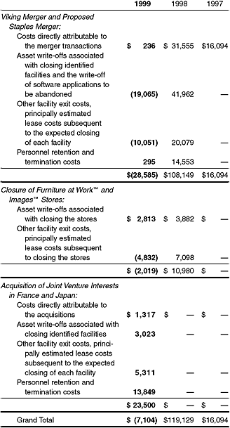 The other adjustments column represents adjustments of original estimates and other adjustments pursuant to plan modifications made during the fourth quarter of 1999. In addition to the amounts we have accrued, we expect to incur additional integration-related costs over the remaining integration periods. Although we expect these costs to be insignificant to our future operating results, there can be no assurance that this will be the case. We expect to rely primarily on cash flows generated from operations to fund our integration-related costs. See Liquidity and Capital Resources. We expected to terminate approximately 171 store, warehouse and support employees worldwide in conjunction with our restructuring and integration plans. To date, all 171 employees have been terminated. We believe the reduction in our revenues and increases in our operating profit arising from these integration activities will be insignificant to our overall and segment results. Store Closure and Relocation Costs We recorded a charge of $46.4 million in the third quarter of 1999 to reflect our decision to accelerate our store closure program for under-performing stores and our relocation program for older stores in our Stores Division. This charge also reflects our decision to sell our interest in our retail operations in Thailand. On October 28, 1999, we entered into an agreement with Central Retail Group, our joint venture partner, to sell to them our Thai operations and license to them certain trademarks, software and operating systems. Central Retail Group now operates the two Thai stores under a licensing agreement. Finally, the charge also reflects our decision to write-off certain other long-lived assets in our BSG. During the fourth quarter of 1999, we reversed $6.0 million of the charge relating to stores that may be relocated after 2000. This reversal is in accordance with guidance issued by the SEC in late 1999 which provides that restructuring charges should not be accrued unless changes in the plan are unlikely, which in most cases requires that planned actions take place within one year. This charge, net of the reversal, consisted of asset impairment costs ($29.2 million), residual lease obligations ($8.3 million) and other exit costs ($2.9 million). Asset impairment costs consist principally of leasehold improvements and other assets that will be retired when the identified stores are closed or relocated. The charge impacted the operating profits of our business segments as follows: