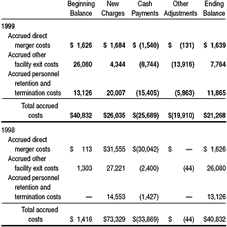 We determined the fair value of assets to be disposed of by estimating the net realizable value at the time of the anticipated closure or discontinuation of use. Estimated proceeds from and costs to dispose of these assets were determined through analysis of historical data and expected outcomes. The costs required to complete our merger and restructuring plans necessarily involve the use of estimates. We believe our estimates are unlikely to change significantly in the future. As of December 25, 1999 and December 26, 1998, we have remaining accruals of approximately $21.3 million and $40.8 million, respectively, for merger and restructuring costs. Amounts expensed for asset write-offs are recorded as a reduction of our fixed assets. All other amounts are recorded as accrued expenses. The activity in the liability accounts by cost category is as follows: