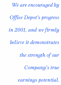 Turning the Tide Our efforts to strengthen Office Depot started in early fall of 2000, when our new leadership team conducted a critical assessment of Office Depot that redefined our destination and plotted a strategic course to get there. Throughout 2001, we continued this process, driving operating improvements that we expect to yield tangible results in the years ahead. Our initiatives were careful and thorough. We sharpened our focus on our core competencies. We improved efficiencies and instituted disciplined capital spending. We introduced dramatic improvements in the management of our supply chain, our inventory, and our warehouse operations. We closed stores, cut costs in underperforming regions in North America and redeployed capital to our highly profitable and fast-growing international markets. We elevated the delivery of fanatical customer service to our first priority, and we established quality indices and ambitious new performance benchmarks. We fostered a management culture that gives our leaders and managers greater responsibility and makes them accountable for results. And we established new corporate values that form the basis for the way we do business and serve as a foundation for our future. We also devoted significant energy and resources to making Office Depot a more compelling place to work and shop. We improved opportunities across the Company for our employees, and we tied recognition and reward directly to performance. We renewed our commitment to diversity, which appropriately reflects our diverse customers, suppliers and communities in which we live and work. We undertook new measures in our North American Retail stores to make shopping at Office Depot a more informative and customer-friendly experience by remerchandising, upgrading and resigning all 859 of our retail superstores. These collective management and operating initiatives enabled Office Depot to perform well in light of the difficult economic environment. Total sales declined four percent to $11.2 billion, compared with $11.6 billion in 2000. Comparable worldwide sales in the 849 stores and 39 delivery centers that have been open for more than one year declined two percent, compared with an increase of seven percent in 2000. At the same time, however, our highly profitable International business delivered to record sales and profits, despite negative foreign currency translation. International now accounts for 27 percent of our Companys total segment operating income. Driven by a dramatic improvement in gross margins across our business segments, earnings per share (excluding charges and credits discussed in managements discussion and analysis), rose to $0.79, an increase of 13 percent, compared with $0.70 in 2000. Free cash flow rose to $540 million, a substantial improvement from $49 million in 2000. Stronger cash flow and an emphasis on better cash management enabled us to repay short-term debt, fund working capital needs and build our financial flexibility. We also achieved marked progress in other vitally important areas of the Company. Employee turnover, a key measure of employee satisfaction, declined 29 percent from a year ago. Our quality and customer satisfaction measurements rose and our retail and warehouse Customer Service Indices hit all-time highs. Our instock positions, order-fill rates, line-fill rates and on-time deliveries also improved. In addition, inventory turns rose, accounts receivables declined and North American warehouse operating costs as a percentage of sales decreased to the lowest level in five years. We are highly encouraged by Office Depots progress in 2001, and we firmly believe it demonstrates the strength of our Companys true earnings potential once the U.S. and world economies regain stability and return to growth. But Office Depots story in 2001 is about far more than financial results and operating improvements. It is about a company that has a crystal-clear vision of where it is going and how it is going to get there. It is about a new management team with the experience, skills and financial acumen to help the Company to achieve its goals. It is about our customers who reward us through their loyalty and our shareholders who once again have confidence that we can drive shareholder value. Moreover, it is about our approximately 45,000 worldwide employees, who have regained their trust in Office Depot and reaffirmed their conviction that we can become one of the worlds great companies. |