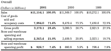 Our overall sales decreased 4% in 2001 and increased 13% in 2000, while comparable sales decreased 2% in 2001 and grew 7% in 2000. Fiscal year 2000 included 53 weeks in accordance with our 52-53 week accounting convention. Adjusting 2000 to a 52-week basis, sales decreased 2% in 2001. The overall sales decrease in 2001 reflects a 10% decrease in our North American Retail Division, a 4% increase in our Business Services Group and a 6% increase in our International Division. Sales across the United States were adversely affected in 2001 by the slowing domestic economy. Additionally, the decline in sales of our North American Retail Division reflects our decision to close 73 stores during 2001, following our comprehensive business review performed in the latter part of 2000. The largest percentage sales increases in 2000 were realized in our BSG segment, driven most significantly by the growth in our contract and Internet businesses. E-commerce sales have improved in all periods, increasing almost 60% in 2001 to $1.6 billion. Also contributing significantly to our sales growth in 2000 was the continued expansion of our store base. Our worldwide sales by product group were as follows: