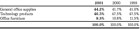 In both 2001 and 2000, our sales mix shifted toward our core office supply items. Sales of technology products decreased significantly in 2001, reflecting to a large extent, a general slowing of technology-related product sales in the overall economy. Moreover, many more general and specialty retailers outside the office products retail segment (including discount retailers, drug store chains and warehouse club retailers) have broadened their assortments of technology products. Technology products generally have lower profit margins compared to many of the core office supplies. Also, within the technology products category, the mix shifted from technology hardware and software towards machine supplies. Sales of office furniture declined, reflecting lower volume and unit prices in 2001 and lower average selling prices during 2000, as many business customers deferred large purchases because of concerns about the economy. Our overall gross profit percentages fluctuate as a result of numerous factors, including competitive pricing pressures; changes in product, catalog and customer mix; emergence of new technology; suppliers pricing changes; as well as our ability to improve our net product costs through growth in total merchandise purchases. Additionally, our occupancy costs may vary as we add stores and CSCs in new markets with different rental and other occupancy costs, and as we relocate and/or close existing stores in current markets. In mid-2000, we reduced prices for paper and machine supplies across all of our domestic sales channels in response to competitive pressures from discount clubs and other non-traditional sellers of those supply items. These price reductions, along with increased product costs, primarily for paper and machine supplies, had the most significant effect on our decreased gross profit percentage in 2000 compared to 1999. These two product groups accounted for approximately 34% of our total sales mix in 2000. |