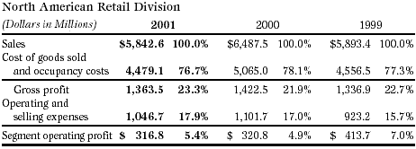 Sales in our North American Retail Division decreased 10% in 2001 and increased 10% in 2000. Adjusting fiscal 2000 results to remove the 53rd week, sales decreased 8% in 2001. The decrease was experienced across all regions of the country and reflects the adverse effect of the weak U.S. economy. Additionally, the sales decline during 2001 reflects the closing of 73 stores identified as under-performing stores as part of the comprehensive business review in late 2000. The sales increase in 2000 was primarily achieved through our store expansion program. For 2001, comparable sales in the 816 stores that had been open for more than one year were down 8%. In 2000, comparable sales were essentially even with 1999. While sales decreased in 2001, gross profit expressed as a percent of sales increased. Sales shifted away from lower-margin computer hardware, software and office furniture and into products such as machine and office supplies, as well as additional copy center services. Sales of computer products declined 26% in 2001 compared with an increase of 3% in 2000, reflecting declines in both volume and average unit price. We are unable to predict when, and to what extent, this trend will reverse. During 1999, we offered low priced units and more aggressive promotional programs on computer products, including an instant rebate program when the customer contracted for Internet service, which resulted in strong sales for that year at lower margin percentages. The Internet service provider instant rebate program was in effect for portions of 2000 and 2001. The sale of business furniture declined 16% in 2001, after increasing 14% in 2000. The decrease in 2001 is consistent with the slowing economy and decisions to cancel or defer office-related purchases. The sale of business machine supplies increased in both periods. Lower margins realized on paper and machine supplies contributed most notably to the decrease in gross profit in 2000 compared to 1999. Increased costs of these core products and decreased prices in response to competitive pressures negatively impacted gross profit. Also in 2000, sales increases in the North American Retail Division were not sufficient to leverage the additional fixed expenses incurred with the addition of new stores. Gross profit includes fixed costs such as occupancy and rental costs for equipment in our print and copy centers. A significant portion of the comprehensive business review completed at the end of 2000 was focused on the North American Retail Division and, among other things, included a commitment to enhance the shoppers experience in our retail stores. To that end, we implemented a Division-wide re-merchandising campaign that included personnel training, improved signage and lighting, improved product adjacencies and additional private label merchandise. Also, as a result of the business review, we closed 70 underperforming stores in early 2001 and another three later in the year. The table above includes charges and credits reported in line items through segment operating profit. In 2000, these charges include $29.5 million to provide for sales returns and allowances, $10.1 million for inventory adjustments and $57.8 million relating to asset impairments and write-downs. Additional charges and credits relating to the North American Retail Division, such as facility closure costs, were reported on line items below segment operating profit and are discussed in the Charges and Credits section above. Fiscal year 2001 includes $35.2 million of charges relating to additional store closures and impairments from 13 additional under-performing stores, three of which were closed during the year. In our North American Retail Division, the largest components of operatingand selling expenses are personnel, facility, advertising and credit card expenses. Each of these components declined in 2001; and total operating and selling expenses, excluding the charges outlined above, decreased 3% in 2001. Personnel costs, which represent over 50% of the total costs in this caption, showed the largest decline as payroll was adjusted down in response to declining sales and from a net reduction in stores. Personnel costs in 2000 were higher than in 1999, primarily because of competitive wage pressure and the need to attract more highly skilled employees in certain positions. Additionally, rent and depreciation expense decreased in 2001 from store closings, partially offset by adding 44 stores during the year. Lower sales in 2001 also contributed to lower credit card fees and reduced advertising. In 2000, we saw an increase in delivery orders as a percentage of total store sales. These orders are delivered by the warehousing operations in our BSG, which allocates a portion of their cost to cover the delivery expense. As explained in the BSG section below, warehouse expenses increased in 2000, which also negatively impacted operating and selling expenses. Delivery and transportation costs declined slightly in 2001. |