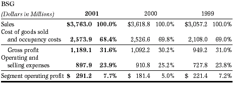 Sales in our BSG segment grew 4% in 2001 and 18% in 2000. Adjusting fiscal 2000 to a 52-week basis, sales increased 6% in 2001. While sales increased for the year, the rate of growth for both contract and commercial business declined over the course of the year, consistent with the slowing U.S. economy. Sales in the western U.S. displayed the greatest decline following the general slowdown in the technology services sector. The growth in 2000 sales reflects an increase in our large business customer base and significant growth in our Internet business. We expect continued growth in our Internet sales during 2002 as we allocate additional resources to that sales channel. Machine supplies include laser, inkjet, and copier supplies, and increased 16% in 2001 and 27% in 2000. General office supplies and paper sales also increased in both periods. Technology-related sales are a smaller part of BSG sales, but they declined in 2001 after showing some gains in 2000. Office furniture sales declined 11% in 2001. Gross profit was enhanced during 2001 as we maintained stricter adherence to volume-dependent pricing arrangements. We earn higher gross profit percentages in our BSG than in our retail operations principally as the result of lower occupancy costs and a relative sales mix with fewer technology products. Paper, machine supplies, and other general office supplies, which yield higher margins than our other product groups, account for a much larger percentage of total sales in our BSG than in our stores. However, BSGs gross profit percentages are lower than in our International Division as a result of the lower relative pricing we negotiate with our contract customers.Contributing to the decrease in our BSGs gross profit from 1999 to 2000 was an increase in paper costs, coupled with reduced prices for paper products, ink and toner in response to competitive pressures. Further, these products increased in our product mix, which compounded the negative impact on gross profit. The 2000 comprehensive business review also covered operations of BSG and included a number of initiatives to improve delivery operations, lower warehouse costs and improve customer satisfaction. Included in fiscal year 2000 results are net charges of $10.9 million for inventory adjustments, sales returns and allowances, and facility closure costs. No similar charges or credits were recorded in 2001. During 2001, on-time deliveries, order fill rates and quality index calculations all increased, and customer complaints decreased significantly. Personnel, facility and delivery expenses are the largest components of our BSG operating expenses. Operating and selling expenses as a percentage of sales decreased in 2001 primarily from reduced personnel and outside labor costs. Call center modifications and warehouse efficiency programs were significant contributors to lower personnel-related costs. Delivery costs decreased as we lowered our use of third-party vendors and added technology to streamline operations. Advertising expenses increased in 2001 as we received lower cooperative advertising payments from participating vendors. Operating and selling expenses as a percentage of sales are significantly higher in our BSG than in our North American Retail Division, principally because of the need for a more experienced and highly compensated sales force that directly calls on our BSG customers. In 2000, operating and selling expenses increased over 1999 primarily as a result of higher delivery costs arising from increased rates charged by third-party carriers, and from personnel-related expenses associated with our warehouse staff. Furthermore, a larger workforce was required to handle the execution of our warehouse integration plans. During the transition into integrated facilities, we incurred certain incremental expenses related to preparing for the increased volume of deliveries and the dual-brand fulfillment in the newly integrated facilities. During 2002, we anticipate two new distribution facilities, one in Atlanta and the other in Baltimore, to replace outdated facilities, which have reached capacity. These new facilities are expected to enhance our ability to grow in these two important markets. |