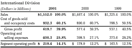 Sales in our International Division grew 6% in 2001 and 11% in 2000. Adjusting fiscal 2000 to a 52-week basis, sales increased 8% in 2001. Foreign currency translations adversely affected sales in all periods. Excluding the foreign currency effect, sales in our International Division grew 11% in 2001 and 23% in 2000. Comparable sales, excluding the foreign currency effect, increased 12% in the current year compared with growth of over 30% in 2000. These increases in 2001 were achieved despite softness experienced in our operations in larger European countries relating to softer economic conditions generally throughout Europe. Although the Office Depott brand continues to grow as a percentage of the total sales in this segment, our Viking Office Productst brand still accounts for the vast majority of our international business, representing approximately 87% of all international sales in 2001 and 88% in 2000. These Viking catalog operations had local currency comparable sales increases of 11% in 2001 and 16% in 2000. Competitive, political, and economic conditions in international markets in which we operate may impact our sales in the future. As noted above, sales in local currencies have substantially increased in recent years. For U.S. reporting, these sales are translated into U.S. dollars at average exchange rates during the year. The strong U.S. dollar has adversely affected reported sales in each of the three years presented, in some cases significantly. To the extent the U.S. dollar continues to strengthen relative to the currencies where we conduct business, this adverse effect on reported sales can be expected to continue. Gross profit as a percentage of sales increased in 2001 and reflects pricing initiatives in certain machine and general office supply categories, partially offset by the introduction of our lower-margin contract sales in certain European countries. The decrease in gross profit as a percent of sales in 2000 resulted from an unfavorable mix shift towards machine supplies, primarily ink and toner cartridges, which yield lower gross profit margins than other products. As with our other segments, our International Division was affected by higher costs for paper and machine supplies in 2000. However, unlike our domestic segments, the effect of these cost increases was lessened with increased pricing in our catalogs during the latter half of the year. Operating and selling expenses as a percentage of sales are higher in our International Division than in our other segments primarily because we use an extensive marketing program to drive sales in new and existing markets, and we have start-up activities in several markets. Similar to our BSG, personnel and delivery expenses are significant components of our International Divisions operating and selling expenses. Additionally, the cost of catalog preparation and mailing is a significant component to support the direct mail channel. Continuing a trend that began in 2000, advertising expenses continued to decline, reflecting the impact of improved mailing efficiencies throughout Europe in 2001, as well as continued improvement in our use of more effective advertising campaigns in Japan. In 1999, increasing competition in many of our established markets, coupled with our efforts to gain market share in certain newer markets, drove up our advertising costs. During 2001, we incurred additional operating expenses related to the start up of contract businesses in Europe along with the acquisition of a contract stationer in Australia. These incremental costs are normal as we continue developing our business in new markets. These expenses are offset by continuing improvement in certain fixed operating expenses. As our operations grow in a particular market, fixed operating expenses decline relative to sales. For example, advertising costs in the form of prospecting and delivery costs, which are affected by the density of the delivery areas, decline as a percentage of sales as the market grows. We expect to leverage certain fixed operating expenses, and our cost to attract new customers should decline as a percentage of sales as we continue to establish our brands and grow our international business. Fiscal 2001 includes a gain of $10.2 million from the sale of a London warehouse and fiscal 2000 includes charges of $5.3 million for closed stores and facilities resulting from the 2000 comprehensive business review. Corporate and Other