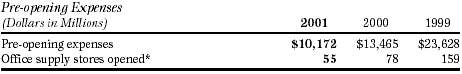 Our pre-opening expenses consist principally of personnel, property and advertising expenses incurred in opening or relocating stores in our North American Retail Division. Our pre-opening expenses also include, to a lesser extent, expenses incurred to open or relocate facilities in our BSG and International Division. We typically incur pre-opening expenses during a six-week period prior to a store opening. Because we expense these items as they are incurred, the amount of pre-opening expenses each year is generally proportional to the number of new stores opened during the period. This has been the primary contribution to the fluctuation in pre-opening expenses over the three years presented. For 2001, our pre-opening expenses approximated $160,000 per domestic office supply store and $101,000 per international office supply store. Our cost to open a new CSC varies significantly with the size and location of the facility. We currently estimate costs to open a domestic or international CSC to be $1.5 million per facility. |