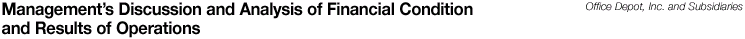 General Office Depot, Inc., together with our subsidiaries, is the largest supplier of office products and services in the world. We sell to consumers and businesses of all sizes through our three business segments: North American Retail Division, Business Services Group, and International Division. These segments include multiple sales channels consisting of office supply stores, a contract sales force, Internet sites, and catalog and delivery operations. Each of these segments is described in more detail below. In 2000, we refined our segment definitions to better reflect our current management responsibilities. Segment information for 1999 and 1998 has been restated to reflect these changes. Also, in accordance with the consensus reached in Emerging Issues Task Force (EITF) 00-10, we reclassified delivery income from store and warehouse operating and selling expenses to sales for all periods presented in this Annual Report. We operate on a 52-or 53-week fiscal year ending on the last Saturday in December. Our results for the fiscal year 2000 contained 53 weeks, all other years contained 52 weeks. This Managements Discussion and Analysis (MD&A) is intended to provide information to assist you in better under-standing and evaluating our financial condition and results of operations. We recommend that you read this MD&A in conjunction with our Consolidated Financial Statements and the Notes to those statements. This MD&A section contains significant amounts of forward-looking information, and is qualified by our Cautionary Statements regarding forward-looking information. You will find Cautionary Statements throughout this MD&A; however, most of them can be found in a separate section immediately following this MD&A. Without limitation, when we use the words believe, estimate, plan, expect, intend, anticipate, continue, project, should, and similar expressions in this Annual Report, we are identifying forward-looking statements, and our Cautionary Statements apply to these terms and expressions. North American Retail Division Our North American Retail Division sells office products, copy and print services and other business-related services under the Office Depot® and the Office PlaceT brands through our chain of high-volume office supply stores in the United States and Canada. We opened our first office supply store in Florida in October 1986. From our inception, we have been a leader in the retail office supplies industry, concentrating on expanding our store base and increasing our sales in markets with high concentrations of small-and medium-sized businesses. As of the end of 2000, our North American Retail Division operated 888 office supply stores in 47 states, the District of Columbia and Canada. Store activity for the last five years has been as follows: