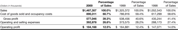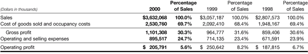 In our BSG segment, we grew sales by 19% in 2000 and by 9% in 1999 primarily through an overall increase in our large business customer base and through significant growth in our Internet business. Our domestic Internet sales increased to $849.5 million in 2000, compared with sales of $349.7 million in 1999 and $66.5 million in 1998. We expect continued growth in our Internet sales during 2001 as we allocate additional resources to that sales channel. We also experienced growth in our Viking Office Products® brand catalog sales in both years, driven by a more targeted approach to catalog promotions. We achieved increases in our Office Depot® brand catalog sales through increased circulation and greater assortment in our direct mail catalogs in both years. Sales of business machine supplies, which are significant to our BSG product mix, increased 27% in 2000 and 26% in 1999. We earn higher gross profit percentages in our BSG than in our retail operations principally as the result of lower occupancy costs and a mix of higher margin products. Paper, machine supplies and other general office supplies, which yield higher margins than our other product groups, account for a much larger percentage of total sales in our BSG than in our stores. However, BSGs gross profit percentages are lower than in our International Division as a result of the lower relative pricing we negotiate with our contract customers. Contributing to the decrease in our BSGs gross profit from 1999 to 2000 was an increase in paper costs, coupled with reduced prices for paper products, ink, and toner necessitated by competitive pressures. Further, these products increased in our product mix, which compounded the negative impact on gross profit. During 1999, we were able to lower our product costs by realizing certain synergies from our merger with Viking, which increased our gross profit over 1998. Personnel, facility and delivery expenses are the largest components of our BSG operating expenses. Operating and selling expenses as a percentage of sales are significantly higher in our BSG than in our North American Retail Division, principally because of the need for a more experienced and highly compensated sales force that directly calls on our BSG customers. In 2000, these expenses increased over 1999 primarily as a result of higher delivery costs arising from increased rates charged by third-party carriers, and from personnel-related expenses associated with our warehouse staff. Furthermore, a larger workforce was required to handle the execution of our warehouse integration plans. During the transition into integrated facilities, we incurred certain incremental expenses related to preparing for the increased volume of deliveries and the dual-brand fulfillment in the newly integrated facilities. Operating and selling expenses as a percentage of sales decreased in 1999 as compared to 1998, primarily because of the costs associated with consolidating and integrating five of our Office Depot CSCs into two larger facilities during 1998. International Division