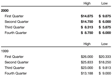 table sets forth, for the periods indicated, the high and