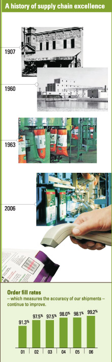 | Even in the earliest days of ScottsMiracle-Gro – long before anyone coined the term ‘supply chain’ – our founders understood the importance of getting accurate shipments of product to consumers on time. In the late 1800s, when the Company focused on farmers, products were delivered by horse-and-buggy. In 1907, when we first sold grass seed to consumers, we depended on the U.S. Mail.