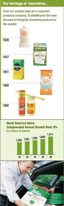 Innovation at ScottsMiracle-Gro starts with our unique understanding of the consumer and the importance that lawn and garden activity plays in their lives. By using this knowledge, we are developing new products that allow us to continually strengthen our relationship with the consumer and drive our business higher. In the past three years, for example, new products have accounted for more than $150 million in sales and a substantial percentage of our growth in the core North American consumer business.