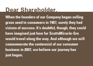 The Company’s most recent results provide good reason for our continued optimism. Fiscal 2006 was another record year for ScottsMiracle-Gro as we improved our market share and reported sales of $2.7 billion, up 14 percent from 2005. Adjusted net income improved 20 percent to a record $181.9 million. These strong results were driven by the strength of our core North American business,the continued momentum of Scotts LawnService and an effort launched in 2005, called Project Excellence, which reduced expenses by about $50 million before reinvestments.