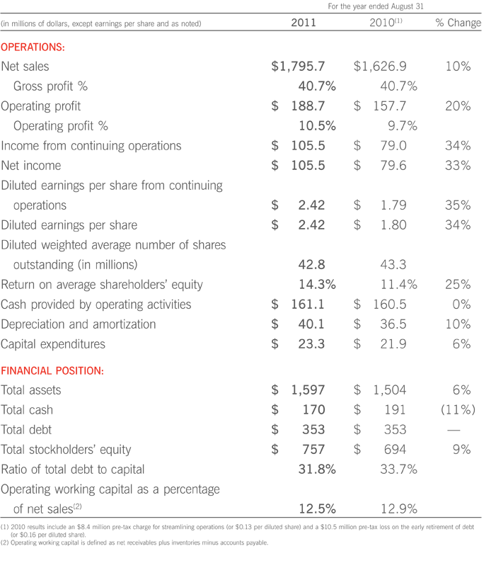 The following charts reflect results from continuing operations. Revenues Revenues Diluted EPS Diluted EPS Operating Profit Operating Profit Free Cash Flow Free Cash Flow Revenues ($ in billions) $1.96 2007 $2.03 2008 $1.66 2009 $1.63 2010 $1.80 2011 Diluted EPS $2.89 2007 $3.51 2008 $2.01 2009 $1.79 2010 $2.42 2011 Operating Profit ($ in millions) Margins $22211.3% 2007 $26112.9% 2008 $1549.3% 2009 $1589.7% 2010 $18910.5% 2011 Free Cash Flow ($ in millions) $177 2007 $195 2008 $72 2009 $139 2010 $138 2011 Free Cash Flow is defined as cash provided by operating activities minus purchases of property, plant, and equipment.