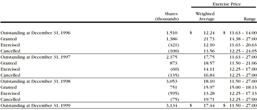 At December 31, 1999, 1998, and 1997 options on approximately 1,283,000 shares, 675,000 shares and 50,000 shares, respectively were exercisable at weighted average exercise prices of $17.18, $17.12, and $14.88, respectively. The weighted average remaining contract life on outstanding options at December 31, 1999, 1998 and 1997 was 5.7 years, 8.4 years and 9.0 years. A summary of activity in the company’s stock option plans is presented below.