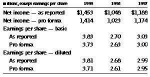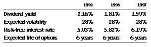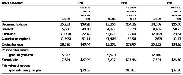 Additionally, certain options were granted in 1997 and 1999 with performance-based features that required the Company's share price to reach specified targets at three- and five-year intervals from the grant date to be earned. In February 1999, the Company extended the period of time allowed to meet the specified targets for the 1997 grants by one year. The Company had 1.1 million, 1.2 million, and 1.4 million performance-based options outstanding at the end of 1999, 1998 and 1997, respectively. Subject to the satisfaction of the performance-based features, these performance-based options vest 50% in year six, 25% in year seven and 25% in year eight from the time of grant. The Company did not recognize compensation expense in 1999, 1998 or 1997 related to these options because the exercise price exceeded the Company share price at each year end. The Company measures compensation cost under Accounting Principles Board Opinion No. 25, "Accounting for Stock Issued to Employees," and no compensation cost has been recognized for its fixed stock option plans. In accordance with SFAS No. 123, "Accounting for Stock-Based Compensation," the fair value of each option grant is estimated on the date of grant using the Black-Scholes option-pricing model. The following assumptions were used during the respective years to estimate the fair value of options granted: