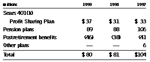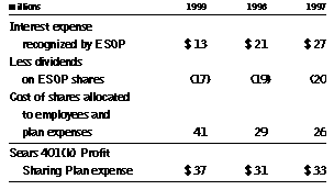 Sharing Plan The Plan includes an Employee Stock Ownership Plan ("the ESOP") to prefund a portion of the Company's anticipated contribution. The Company provided the ESOP with a loan that was used to purchase Sears common shares in 1989. In June 1998, the ESOP refinanced the loan and extended its maturity to 2024. The purchased shares represent deferred compensation expense, which is presented as a reduction of shareholders' equity and recognized as expense when the shares are allocated to employees to fund the Company contribution. The per share cost of Sears common shares purchased by the ESOP in 1989 was $15.27. The Company uses the ESOP shares to fund the Company contribution, which thereby reduces expense. The ESOP loan bears interest at 6.1% (9.2% prior to refinancing) and is repaid from dividends on the ESOP shares and additional cash payments provided by the Company. The Company has contributed cash to the ESOP annually in the amount equal to the ESOP's required interest and principal payments on the loan, less dividends received on the ESOP shares. The cash payments amounted to $57, $24 and $23 million in 1999, 1998 and 1997, respectively. The balance of the ESOP loan was $210 and $267 million at January 1, 2000 and January 2, 1999, respectively. Cash on hand in the ESOP at January 1, 2000 was $4 million. The reported expense is determined as follows: