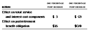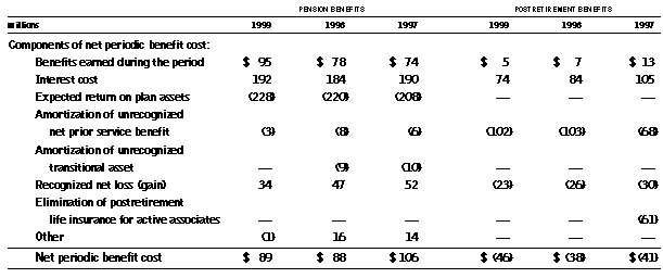 The projected benefit obligation, accumulated benefit obligation and fair value of plan assets for the pension plans with accumulated benefit obligations in excess of plan assets were $2,236, $2,110 and $1,866 million, respectively, at January 1, 2000, and $2,309, $2,210 and $1,845 million, respectively, at January 2, 1999. The provisions of SFAS No. 87, "Employers' Accounting for Pensions," require the recognition of a minimum pension liability for each defined benefit plan for which the accumulated benefit obligation exceeds plan assets. The minimum pension liability, net of tax, was $195 million at January 1, 2000 and $299 million at January 2, 1999, and is included in accumulated other comprehensive income as a reduction of shareholders' equity. In 1997, the Company announced changes to its postretirement life insurance benefit plan. Retiree life insurance benefits were eliminated for all active associates not retired by December 31, 1997. This plan change resulted in a one-time pretax gain of $61 million. In connection with the elimination of retirement life insurance benefits for all active associates, the Company also announced the reduction in life insurance over a 10-year period to a maximum coverage of $5,000 for all post-1977 retirees. The weighted average health care cost trend rate used in measuring the postretirement benefit expense in 2000 is 6.0% for pre-65 retirees and 7.5% for post-65 retirees. For 2001 and beyond, the trend rates are 5.0% for pre-65 retirees and 6.5% for post-65 retirees. A one percentage point change in the assumed health care cost trend rate would have the following effects:
