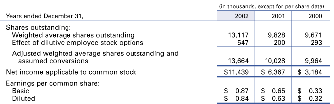 The valuation allowance for deferred tax assets decreased by $677,000, $300,000 and $3,008,000 in 2002, 2001 and 2000, respectively. Management believes it is more likely than not that the Company's future earnings will be sufficient to ensure the realization of deferred tax assets for federal and state purposes. Note 15. Earnings per Common Share Basic earnings per common share is calculated by dividing net income available to common stockholders by the weighted average number of common shares outstanding during the year. Diluted earnings per common share is calculated by using the weighted average number of common shares outstanding adjusted to include the potentially dilutive effect of outstanding stock options. The following table