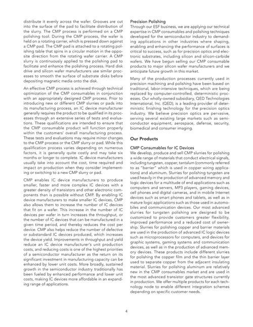 distribute it evenly across the wafer. Grooves are cut into the surface of the pad to facilitate distribution of the slurry. The CMP process is performed on a CMP polishing tool. During the CMP process, the wafer is held on a rotating carrier, which is pressed down against a CMP pad. The CMP pad is attached to a rotating polishing table that spins in a circular motion in the opposite direction from the rotating wafer carrier. A CMP slurry is continuously applied to the polishing pad to facilitate and enhance the polishing process. Hard disk drive and silicon wafer manufacturers use similar processes to smooth the surface of substrate disks before depositing magnetic media onto the disk. An effective CMP process is achieved through technical optimization of the CMP consumables in conjunction with an appropriately designed CMP process. Prior to introducing new or different CMP slurries or pads into its manufacturing process, an IC device manufacturer generally requires the product to be qualified in its processes through an extensive series of tests and evaluations. These qualifications are intended to ensure that the CMP consumable product will function properly within the customers’ overall manufacturing process. These tests and evaluations may require minor changes to the CMP process or the CMP slurry or pad. While this qualification process varies depending on numerous factors, it is generally quite costly and may take six months or longer to complete. IC device manufacturers usually take into account the cost, time required and impact on production when they consider implementing or switching to a new CMP slurry or pad. CMP enables IC device manufacturers to produce smaller, faster and more complex IC devices with a greater density of transistors and other electronic components than is possible without CMP. By enabling IC device manufacturers to make smaller IC devices, CMP also allows them to increase the number of IC devices that fit on a wafer. This increase in the number of IC devices per wafer in turn increases the throughput, or the number of IC devices that can be manufactured in a given time period, and thereby reduces the cost per device. CMP also helps reduce the number of defective or substandard IC devices produced, which increases the device yield. Improvements in throughput and yield reduce an IC device manufacturer’s unit production costs, and reducing costs is one of the highest priorities of a semiconductor manufacturer as the return on its significant investment in manufacturing capacity can be enhanced by lower unit costs. More broadly, sustained growth in the semiconductor industry traditionally has been fueled by enhanced performance and lower unit costs, making IC devices more affordable in an expanding range of applications.