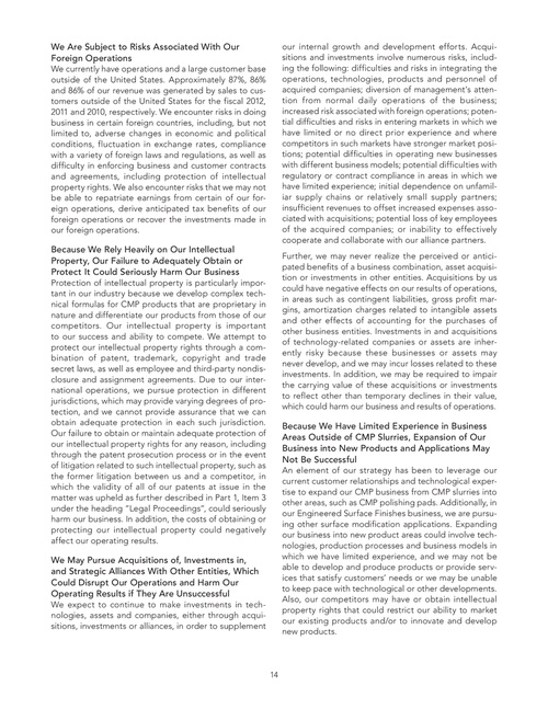 An element of our strategy has been to leverage our current customer relationships and technological expertise to expand our CMP business from CMP slurries into other areas, such as CMP polishing pads. Additionally, in our Engineered Surface Finishes business, we are pursuing other surface modification applications. Expanding our business into new product areas could involve technologies, production processes and business models in which we have limited experience, and we may not be able to develop and produce products or provide services that satisfy customers’ needs or we may be unable to keep pace with technological or other developments. Also, our competitors may have or obtain intellectual property rights that could restrict our ability to market our existing products and/or to innovate and develop new products.