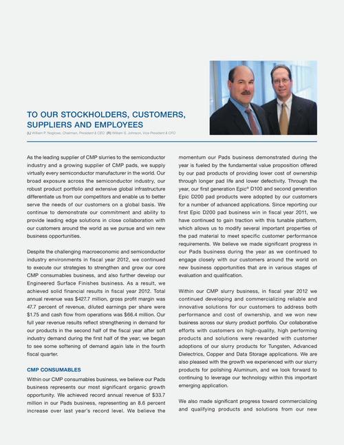 As the leading supplier of CMP slurries to the semiconductor industry and a growing supplier of CMP pads, we supply virtually every semiconductor manufacturer in the world. Our broad exposure across the semiconductor industry, our robust product portfolio and extensive global infrastructure differentiate us from our competitors and enable us to better serve the needs of our customers on a global basis. We continue to demonstrate our commitment and ability to provide leading edge solutions in close collaboration with our customers around the world as we pursue and win new business opportunities. Despite the challenging macroeconomic and semiconductor industry environments in fiscal year 2012, we continued to execute our strategies to strengthen and grow our core CMP consumables business, and also further develop our Engineered Surface Finishes business. As a result, we achieved solid financial results in fiscal year 2012. Total annual revenue was $427.7 million, gross profit margin was 47.7 percent of revenue, diluted earnings per share were $1.75 and cash flow from operations was $66.4 million. Our full year revenue results reflect strengthening in demand for our products in the second half of the fiscal year after soft industry demand during the first half of the year; we began to see some softening of demand again late in the fourth fiscal quarter. CMP CONSUMABLES Within our CMP consumables business, we believe our Pads business represents our most significant organic growth opportunity. We achieved record annual revenue of $33.7 million in our Pads business, representing an 8.6 percent increase over last year’s record level. We believe the