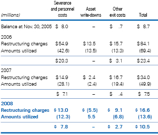The major components of the restructuring charges and the remaining accrual balance relating to the restructuring plan as of November 30, 2006, 2007 and 2008 follow: