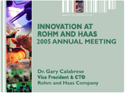 imagine the possibilities™ INNOVATION AT ROHM AND HAAS 2005 Annual Meeting Dr. Gary Calabrese, Vice President and CTO speaks about innovation at Rohm and Haas... click here for ppt presentation >>