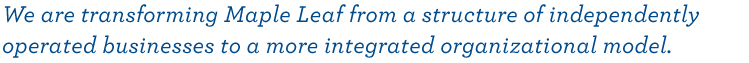 Our goal is to combine the resilience, creativity and accountability of entrepreneurship at the operating level with the expertise that world-class leaders can bring to functions that are common across our businesses food safety, marketing, human resources, finance, logistics, manufacturing and Six Sigma. We added additional breadth to our leadership talent this year by recruiting three senior executives to lead food safety, marketing and logistics, who bring global best practices to their areas of responsibility. They will drive key parts of our strategic agenda: to become a food safety leader; building our strength in consumer packaged foods innovation and marketing; and achieve greater efficiency and cost reductions across our supply chain.