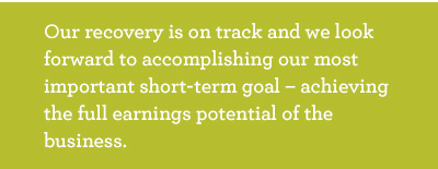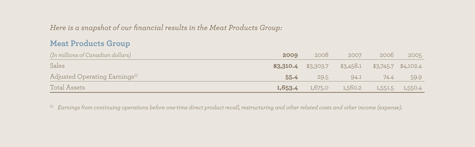 | We would be in a very different place today if not for the major sliced meats recall in August of 2008, which not only had tragic consequences, but also cost our company over $100 million in direct and indirect costs. During 2009, our focus was to rebuild margins and volumes in our packaged meats business. We have made good progress, with Maple Leaf brand sales recovering to within 10-15% of pre-recall levels. Unfortunately, the residual impact on our financial performance has masked some very material benefits from the restructuring. Fully restoring this business will be the most material driver of near-term earnings growth and we are committed to achieving this in 2010.