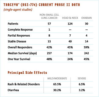 Tarceva (OSI-774), our small molecule anti-cancer agent, is a selective and orally active inhibitor of EGFR and is currently being tested in clinical trials. We have now completed Phase II trials for Tarceva (OSI-774) in non-small cell lung cancer, head and neck cancer and ovarian cancer. Patients in these trials had advanced or metastatic cancer and had generally failed standard treatment regimens. Objective evidence of anti-tumor activity manifested itself as partial responses and disease stabilization. The principal side effect seen for Tarceva (OSI-774) is an acneiform rash that is observed in approximately 72% of patients.