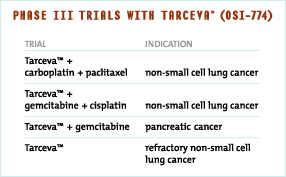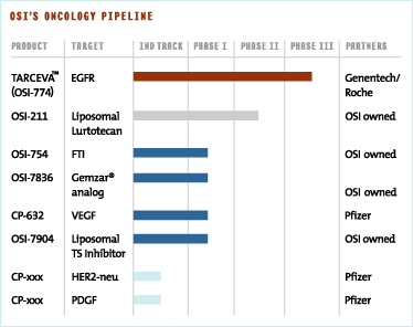OSI has for many years conducted drug discovery efforts in targeted therapies. The first advanced drug candidate to emerge from these efforts is Tarceva (OSI-774), a small molecule inhibitor of the epidermal growth factor receptor (EGFR). Tarceva (OSI-774) is currently in Phase III clinical trials for non-small cell lung cancer and pancreatic cancer. We believe the acquisition of Gilead’s oncology assets will complement our drug discovery engine and accelerate our development and commercialization capabilities with the addition of a world-class drug development and oncology group. With this acquisition we have also augmented our pipeline of gene-targeted small molecule therapeutics with several promising next-generation cytotoxic agents currently in clinical development.