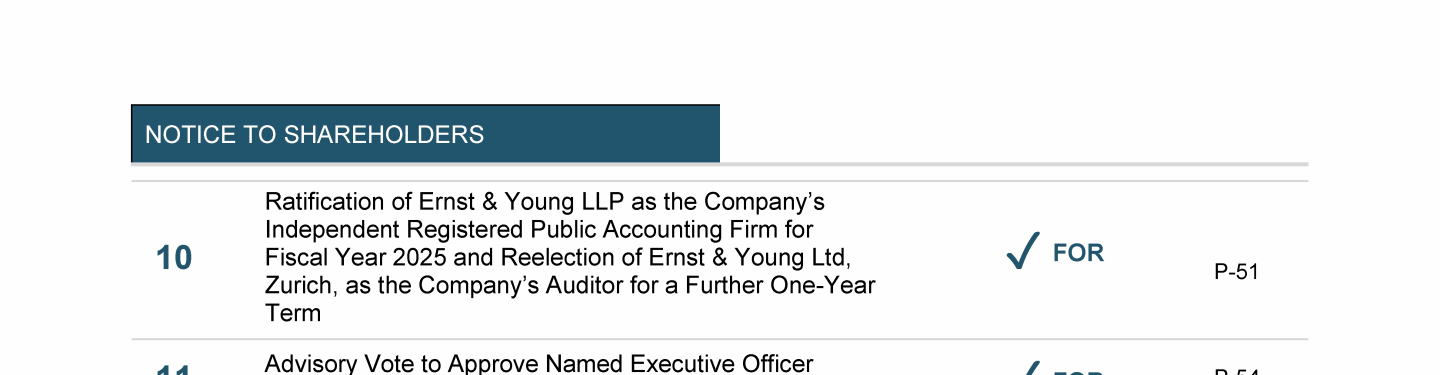 Agenda Item 10. Ratification of Ernst & Young LLP as the Company's Independent Registered Public Accounting Firm for Fiscal Year 2025 and Reelection of Ernst & Young Ltd, Zurich, as the Company's Auditor for a Further One-Year Term