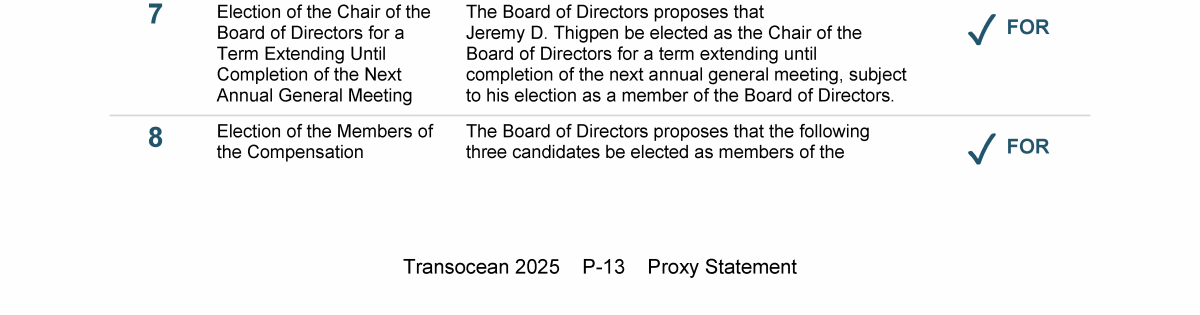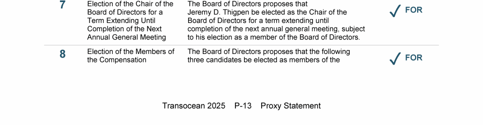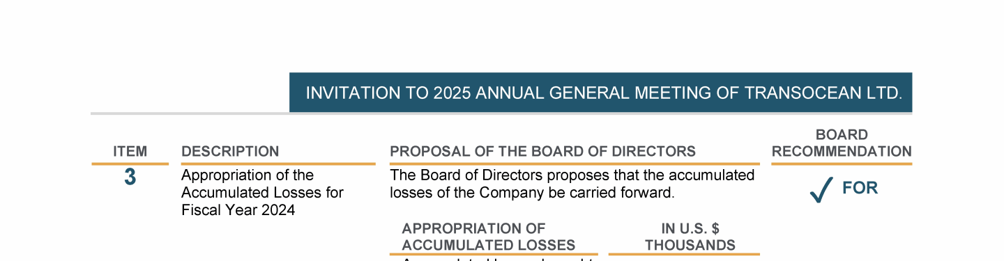 Agenda Item 1. Approval of (A) the 2024 Annual Report, Including the Audited Consolidated Financial Statements of Transocean Ltd. for Fiscal Year 2024 and the Audited Statutory Financial Statements of Transocean Ltd. for Fiscal Year 2024, (B) the Swiss Statutory Compensation Report for Fiscal Year 2024 and (C) the Swiss Statutory Report on Non-Financial Matters for Fiscal Year 2024
