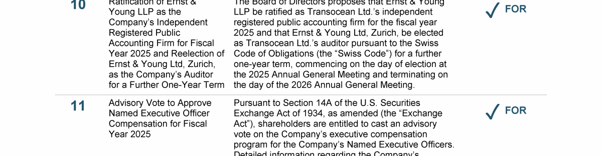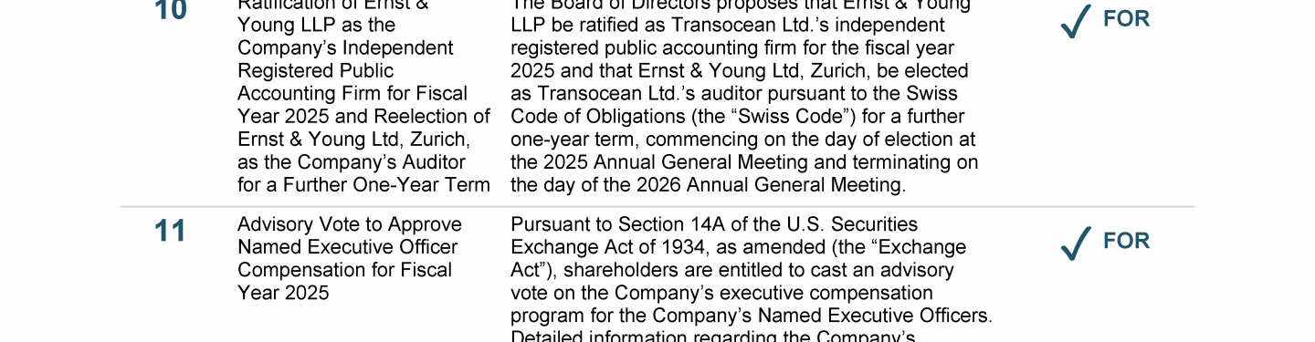Agenda Item 1. Approval of (A) the 2024 Annual Report, Including the Audited Consolidated Financial Statements of Transocean Ltd. for Fiscal Year 2024 and the Audited Statutory Financial Statements of Transocean Ltd. for Fiscal Year 2024, (B) the Swiss Statutory Compensation Report for Fiscal Year 2024 and (C) the Swiss Statutory Report on Non-Financial Matters for Fiscal Year 2024