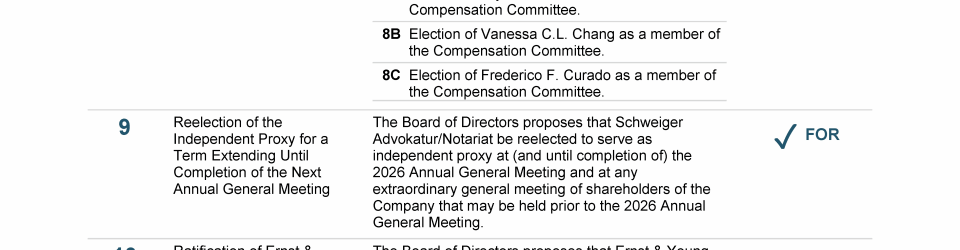 Agenda Item 10. Ratification of Ernst & Young LLP as the Company's Independent Registered Public Accounting Firm for Fiscal Year 2025 and Reelection of Ernst & Young Ltd, Zurich, as the Company's Auditor for a Further One-Year Term