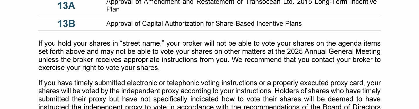 Agenda Item 13. Approval of (A) Amendment and Restatement of Transocean Ltd. 2015 Long-Term Incentive Plan and (B) Capital Authorization for Share-Based Incentive Plans
