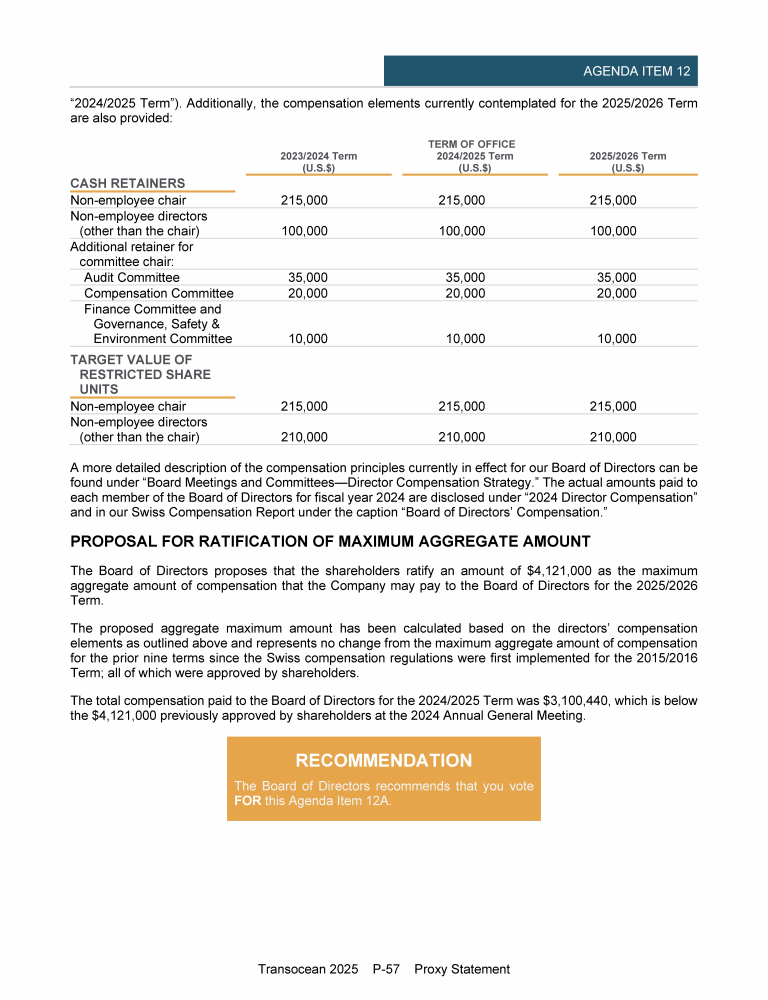Agenda Item 1. Approval of (A) the 2024 Annual Report, Including the Audited Consolidated Financial Statements of Transocean Ltd. for Fiscal Year 2024 and the Audited Statutory Financial Statements of Transocean Ltd. for Fiscal Year 2024, (B) the Swiss Statutory Compensation Report for Fiscal Year 2024 and (C) the Swiss Statutory Report on Non-Financial Matters for Fiscal Year 2024