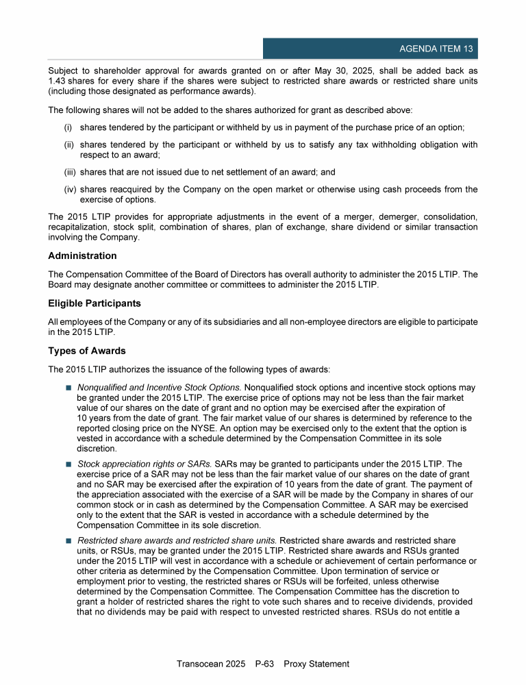 Agenda Item 13. Approval of (A) Amendment and Restatement of Transocean Ltd. 2015 Long-Term Incentive Plan and (B) Capital Authorization for Share-Based Incentive Plans
