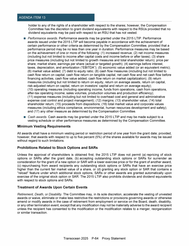 Agenda Item 13. Approval of (A) Amendment and Restatement of Transocean Ltd. 2015 Long-Term Incentive Plan and (B) Capital Authorization for Share-Based Incentive Plans
