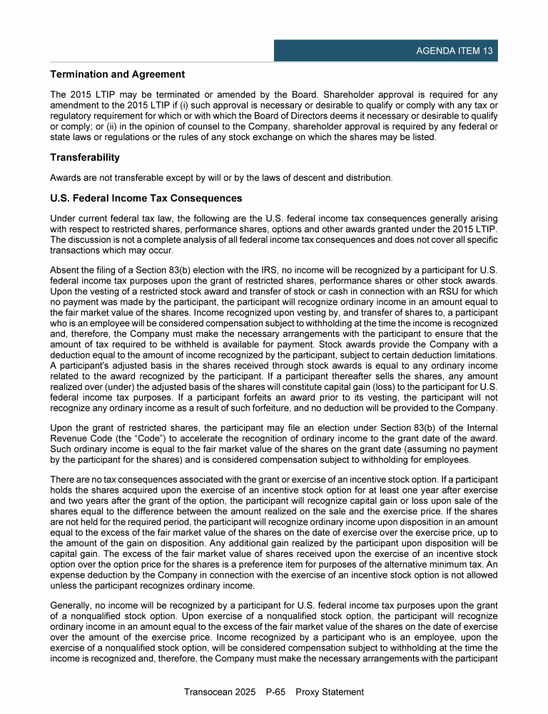 Agenda Item 13. Approval of (A) Amendment and Restatement of Transocean Ltd. 2015 Long-Term Incentive Plan and (B) Capital Authorization for Share-Based Incentive Plans
