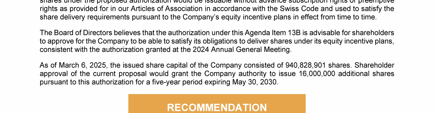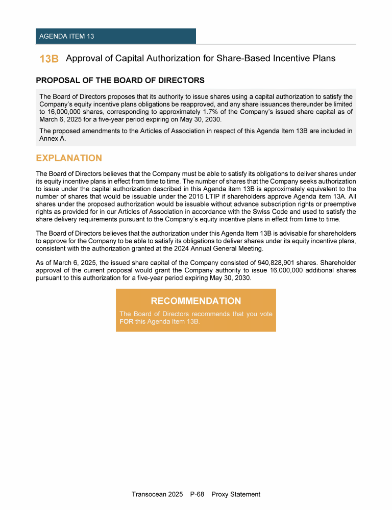 Agenda Item 13. Approval of (A) Amendment and Restatement of Transocean Ltd. 2015 Long-Term Incentive Plan and (B) Capital Authorization for Share-Based Incentive Plans